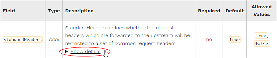 Detailed lists, such as the list of all standard allow headers, are displayed collapsed until you click on Show details (see example screenshot).