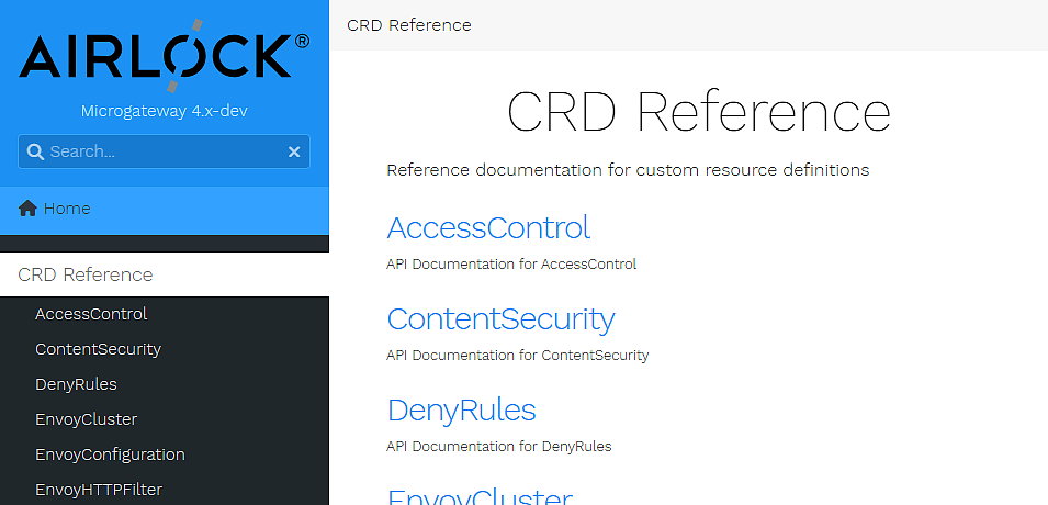 The Airlock Microgateway API documentation is a self-contained code-generated HTML documentation with an integrated search and navigation column.