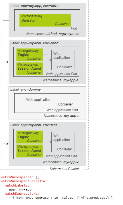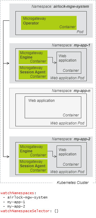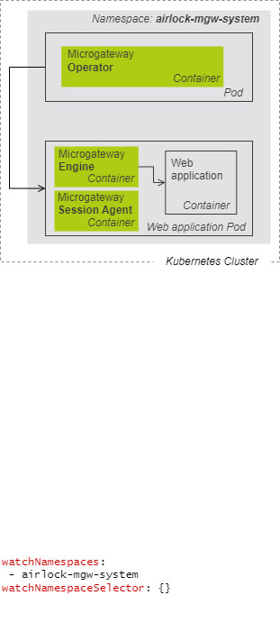 For a production environment, multi-namespace installations are commonly used where Airlock Microgateway Operator can watch and operate web application Pods installed in multi-namespace setups. This allows, i.e., to separate production from staging and development.