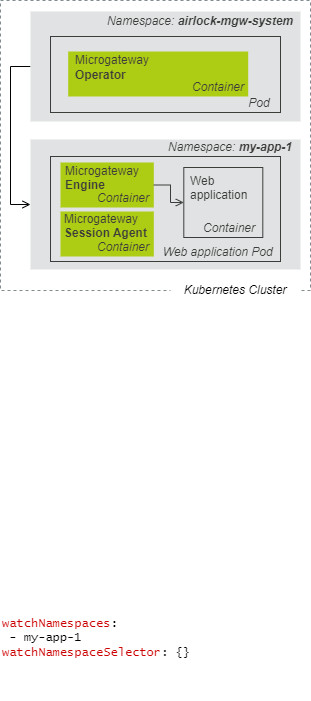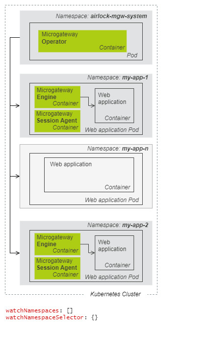 In a simple AllNamespace installation mode, the Airlock Microgateway Operator and web application Pods with SidecarGateways can be deployed in multiple separate namespaces. | In a dynamic MultiNamespace installation mode, the Airlock Microgateway Operator and web application Pods with SidecarGateways are deployed in multiple separate namespaces. |