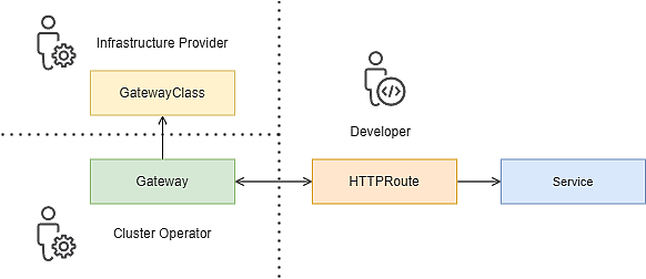 - The Cluster operator manages the Gateway resource and may define cluster-wide routing limitations for xRoute resources such as HTTPRoute.