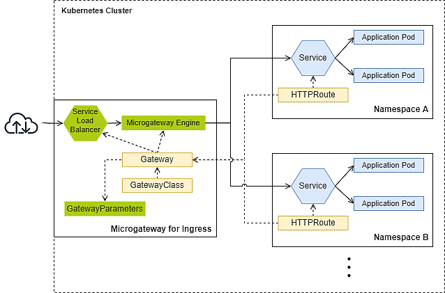 Description | A Microgateway as Ingress protects multiple upstream services from different namespaces. | An in-cluster Microgateway protects upstream services within the same namespace. |