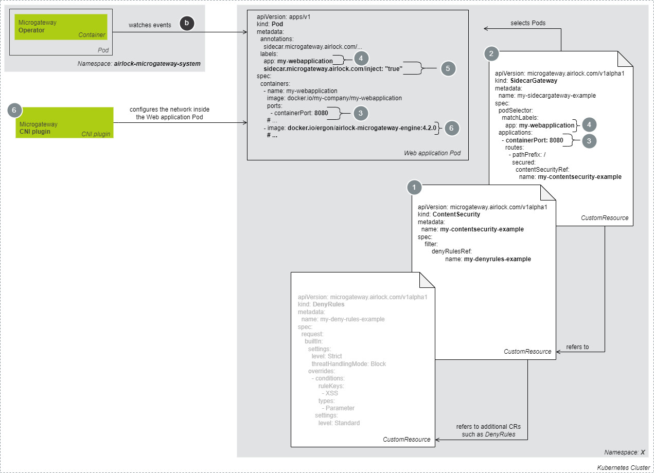 The Microgateway Operator container injects the Microgateway Engine Container into web application Pods labeled with sidecar.microgateway.airlock.com/inject: “true”. In addition, the Microgateway Operator monitors these pods and reconfigures them whenever a Custom Resource changes.