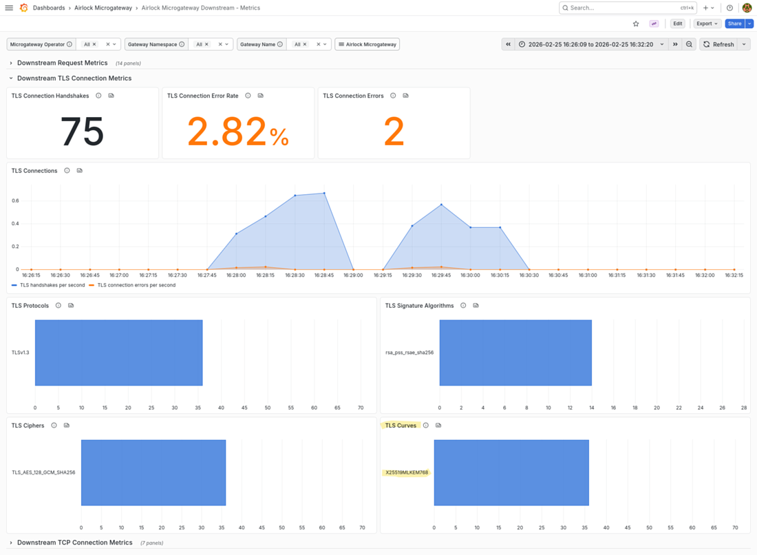The built-in Grafana dashboard Airlock Microgateway Downstream - Metrics shows the TLS supported groups used in successful TLS connections.