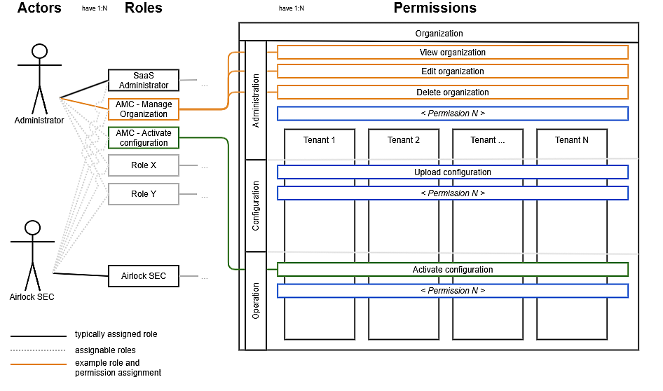 In Airlock SaaS, users that interact with the Airlock SaaS Management Center (AMC) are called actors. Actors hold certain roles with corresponding permissions. These permissions allow performing the tasks associated with the role. By assigning a role to a user, the corresponding permissions are granted.